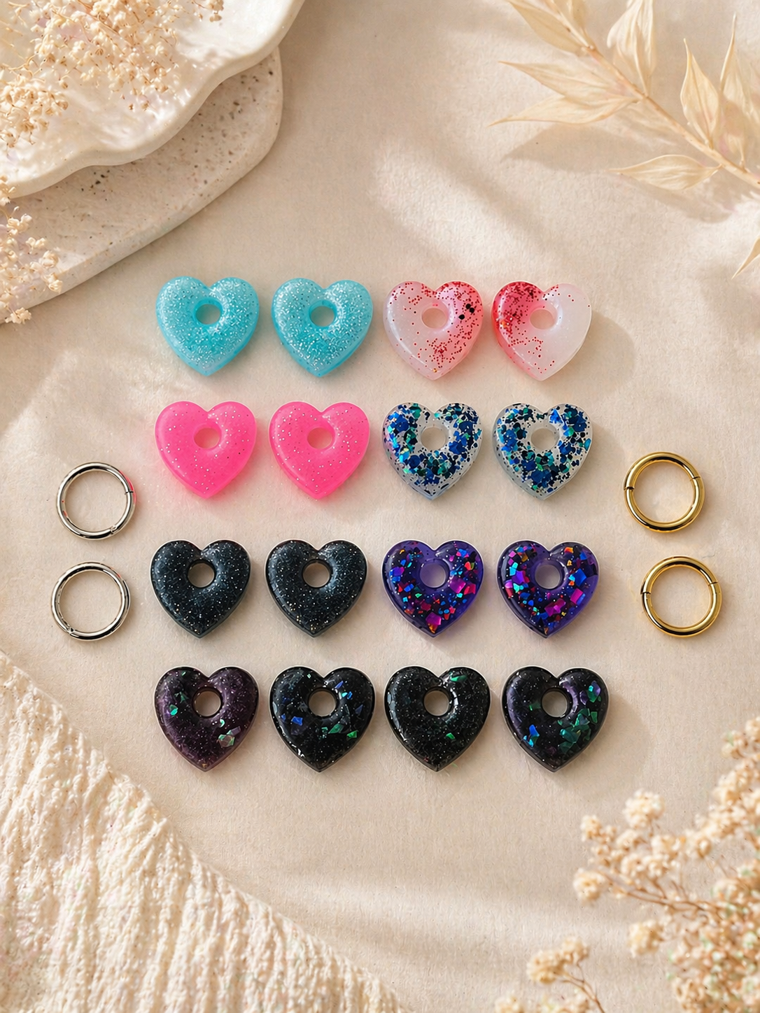 Pampilles d’oreilles "cœur" en résine époxy (2 cm), faites à la main.